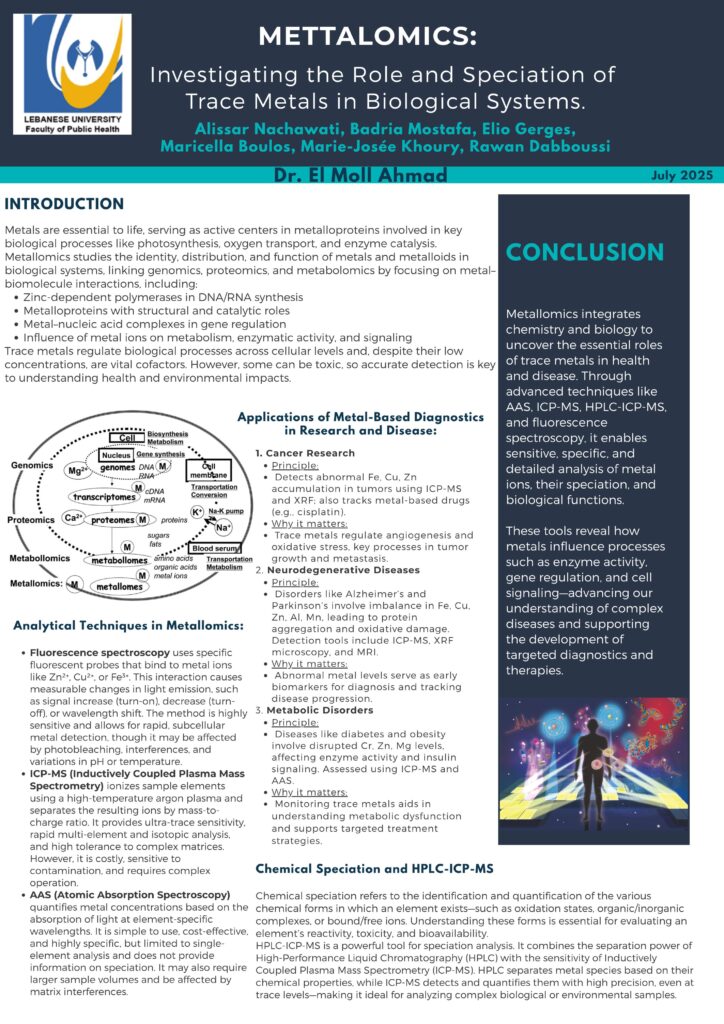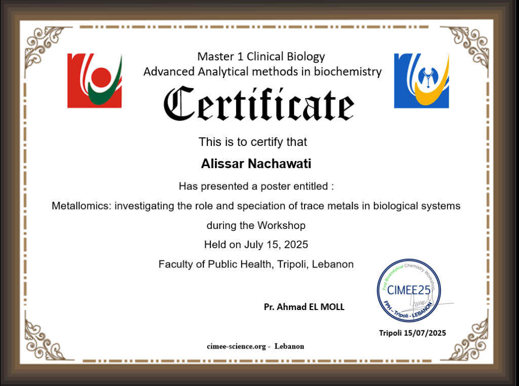 This workshop held on July 15, 2025, Faculty of Public Health, Tripoli, Lebanon was aimed at early career scientists, mainly Master’s students in Master Clinical Biology, (Course Advanced analytical methods in biochemistry) to improve their bioanalytical skills. This event addressed the issues related to the analysis of large and small molecules and also addressed the challenges related to analysis by electrophoresis, NMR, fluorescence spectroscopy, mass spectroscopy, inductively coupled plasma mass spectrometry, ICP-MS, chromatography, and LC-MS, GC-MS, and mass spectrometry, including advanced techniques for biological sample preparation (LLE, SPE, SPME, derivatization, etc.) to explore several themes: Metallomics, proteomic analysis, metabolomics, and sample preparation.