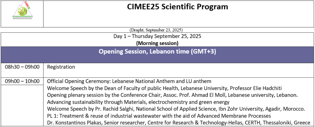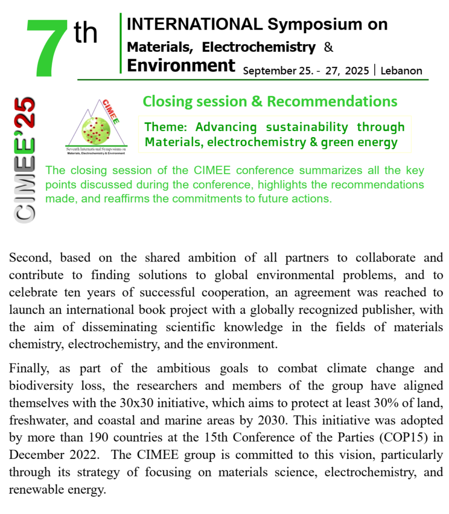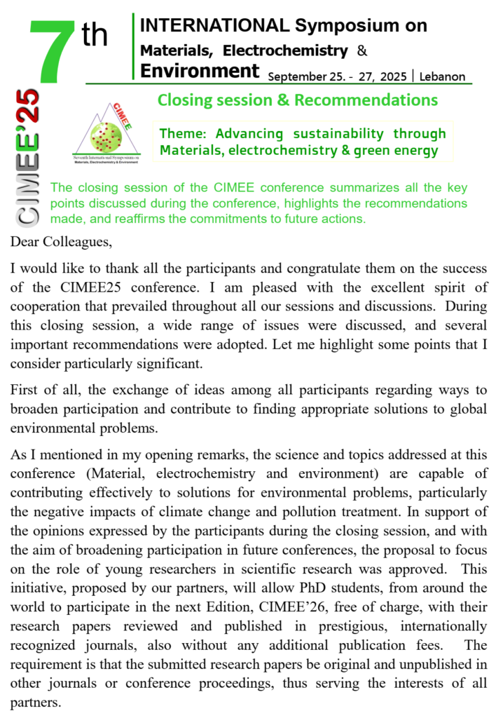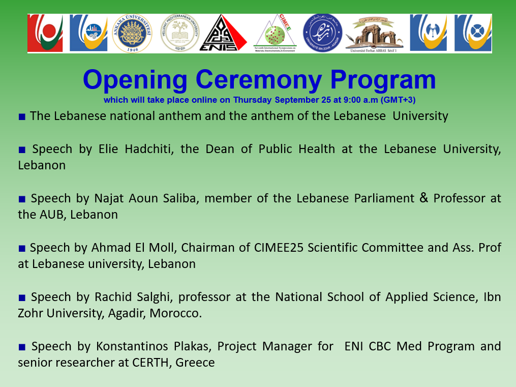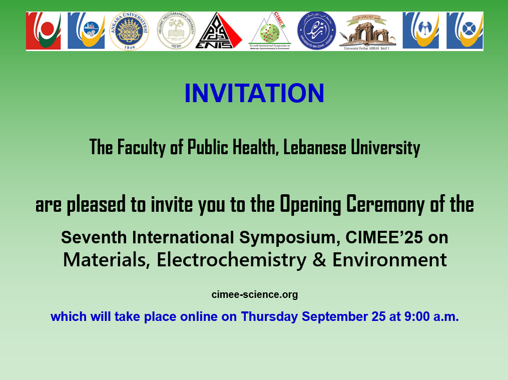 The opening ceremony of the 7th International Symposium on Materials, Electrochemistry, and Environment will take place from September 25-27, 2025 LEBANON