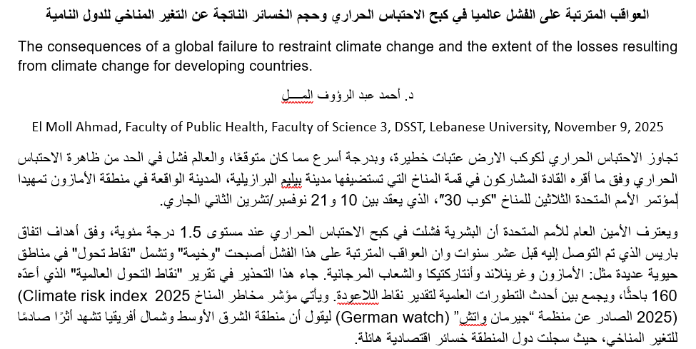 Dear colleagues, kindly find attached the article describing the national efforts and strategy aimed at reducing greenhouse gas emissions as part of a comprehensive climate roadmap for Lebanon’s participation in the 30th Conference of the Parties to the United Nations Framework Convention on Climate Change (COP30) which will be held in Brazil in November 2025.